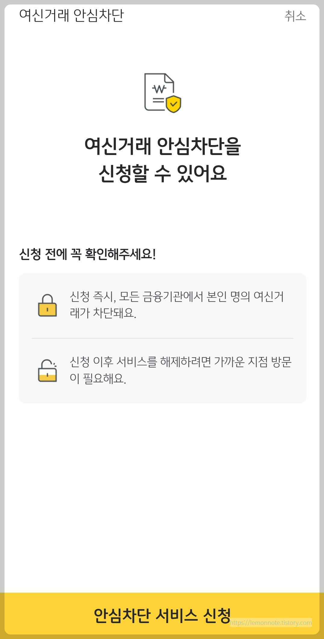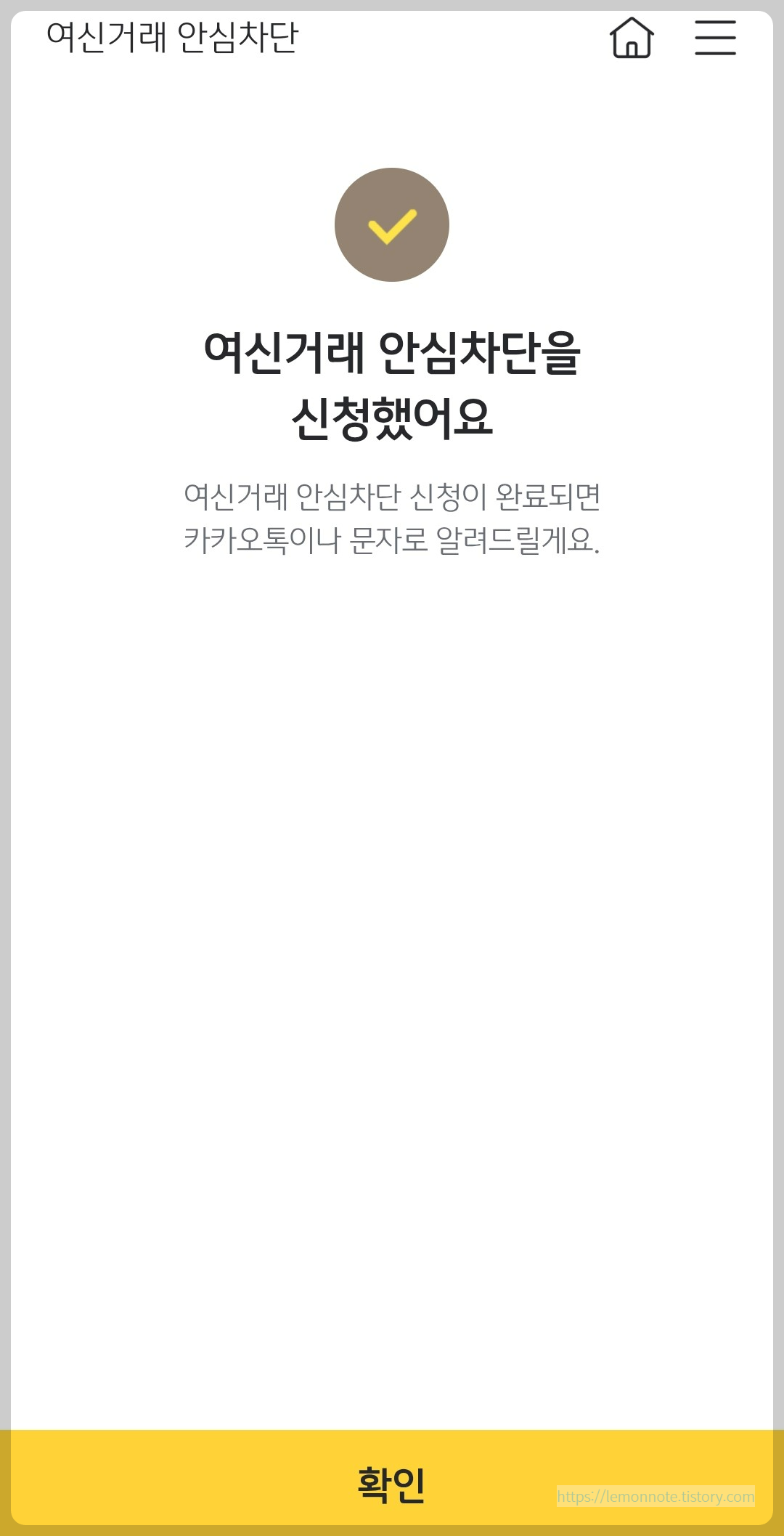5> <안신차단 서비스 신청>을 선택하면 "여신거래 안심차단을 신청했어요"라는 문구가 나옵니다.
